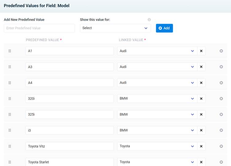 - Once the Linked value field is selected, the Predefined list needs to be edited, and link values must be assigned to the Predefined list.